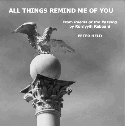 The Poems of the Passing, written shortly after the passing of the Guardian of the Bahá’í Faith, Shoghi Effendi Rabbani, have been published in 1996. In 1937 Shoghi Effendi married Mary Sutherland Maxwell, who from that time on was known as Ruhiyyih Rabbani. After his passing, on 4th November 1957, Ruhiyyih Rabbani followed his advice to travel after his passing and promulgated the Bahá’í-teachings; she eventually visited 185 countries, independent territories and major islands of the world. I found the book and felt inspired to set a few of the poems to music. Ruhiyyih Rabbani heard of a concert recording of some of these compositions and wrote: „It is always encouraging to know that something that means a great deal to you personally, such as my Poems of the Passing obviously mean to me, has served to touch the hearts of other people as well… I am glad, that the poems can be shared with other people…“